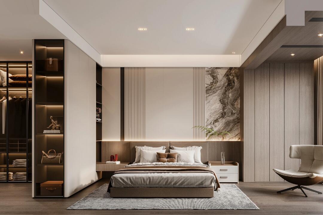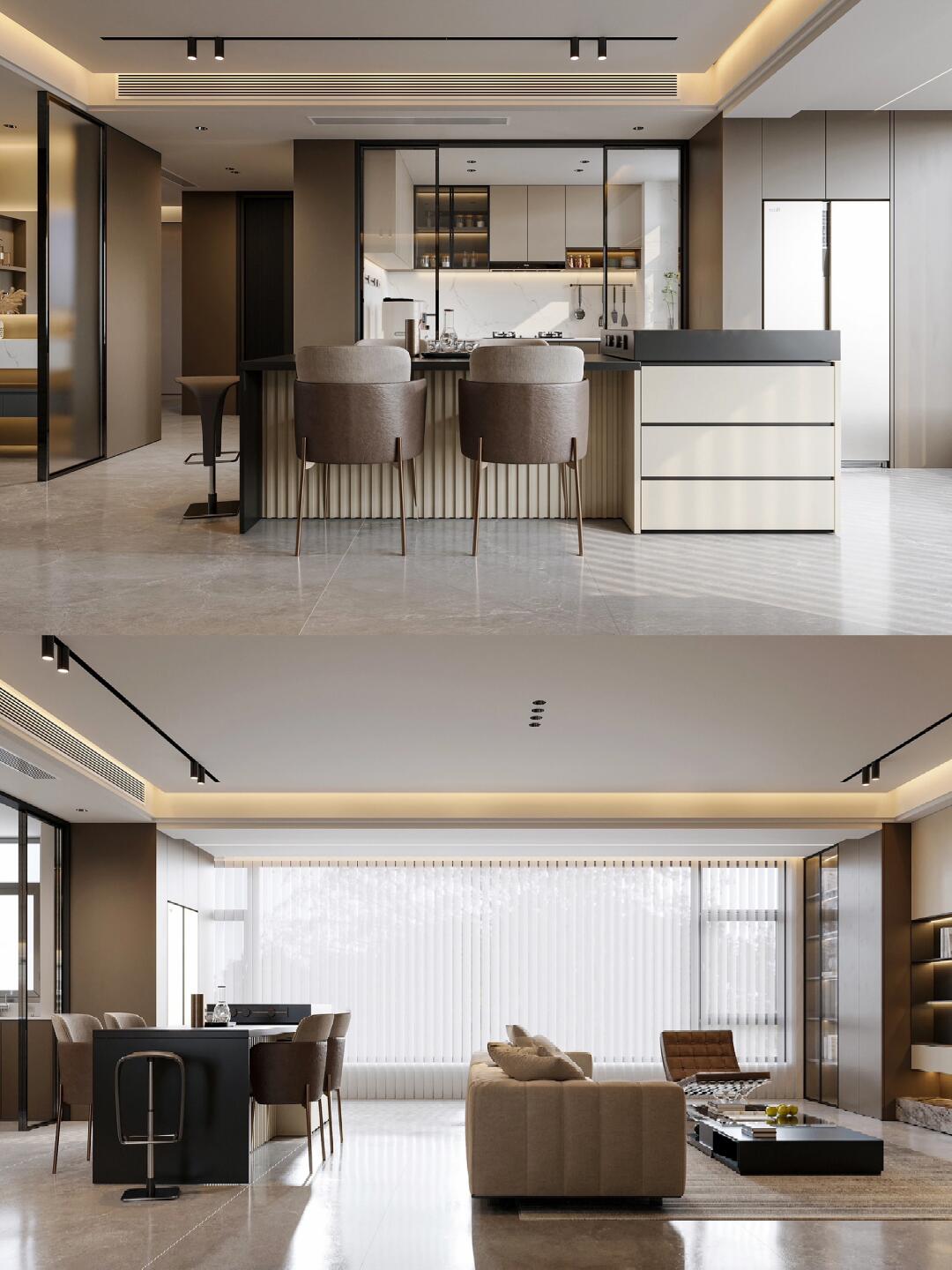 本案整體以意式輕奢風(fēng)為主,強(qiáng)調(diào)空間的通透與舒適感,色調(diào)上以暖咖系為主基調(diào),
