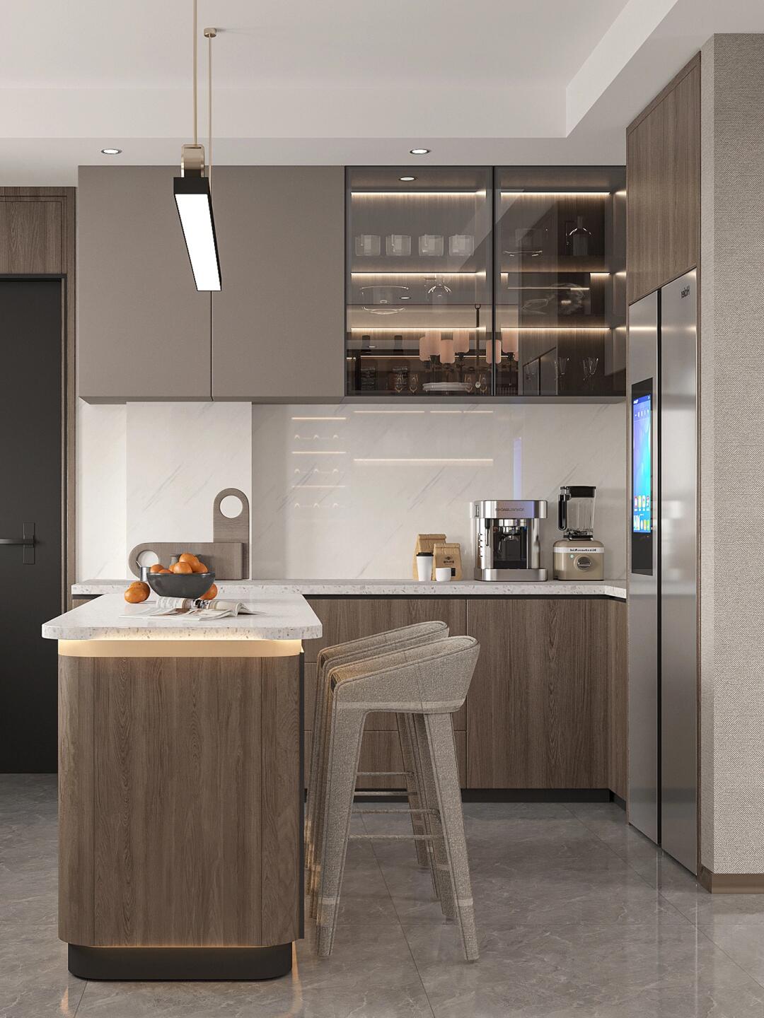 灰色主沙發(fā)搭配咖色抱枕,定制的大理石材質(zhì)島臺與廚房完美銜接。
