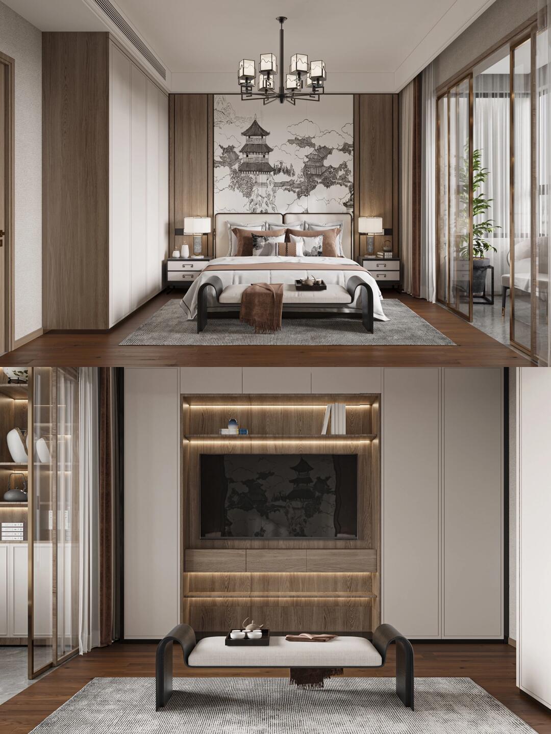 主臥室在飾品的選用上同樣以簡約風格為主,咖色床品搭配木飾面的床頭高背景墻。