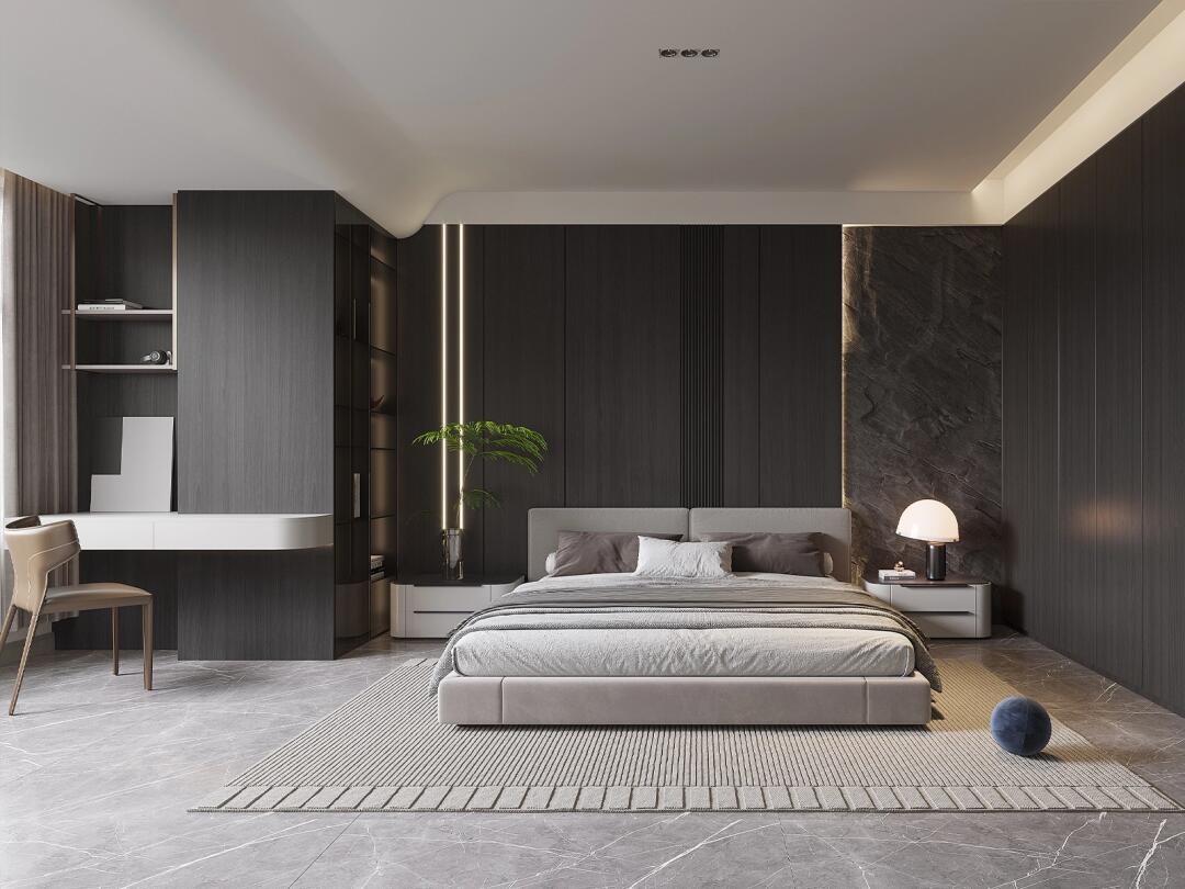主臥遵循古典美式的獨(dú)特韻味,深咖色墻板自帶高級(jí)復(fù)古感,