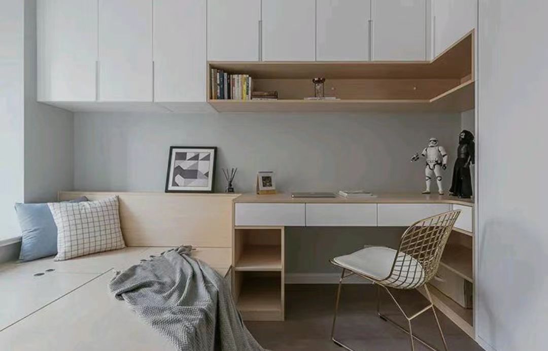可以將衣柜與書(shū)柜一體化設(shè)計(jì),書(shū)桌空間往上延伸可利用隔板解決零碎物品的收納和陳列問(wèn)題。