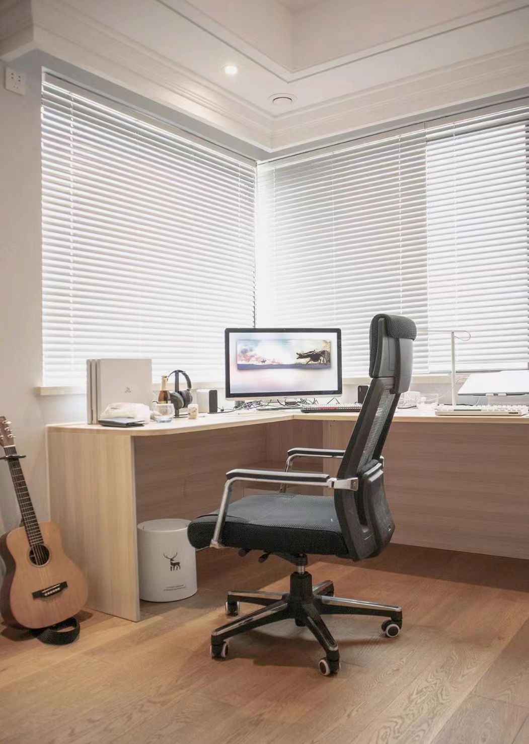 平時(shí)藏書不多,喜歡游戲和音樂。采用了L型桌面布局,臺(tái)面用于電腦的擺放,墻面則做書本的收納區(qū)。